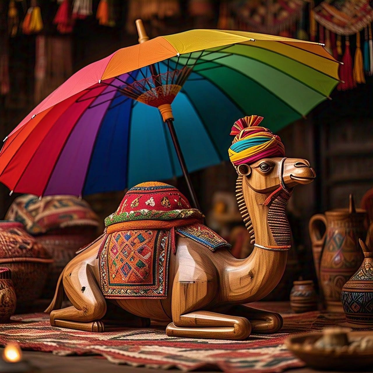 Yeh stunning Rajasthani inspired wooden camel vibrant rainbow umbrella ke saath design kiya gaya hai. Iska colorful traditional look kisi bhi space ko instantly lively aur attractive bana deta hai.